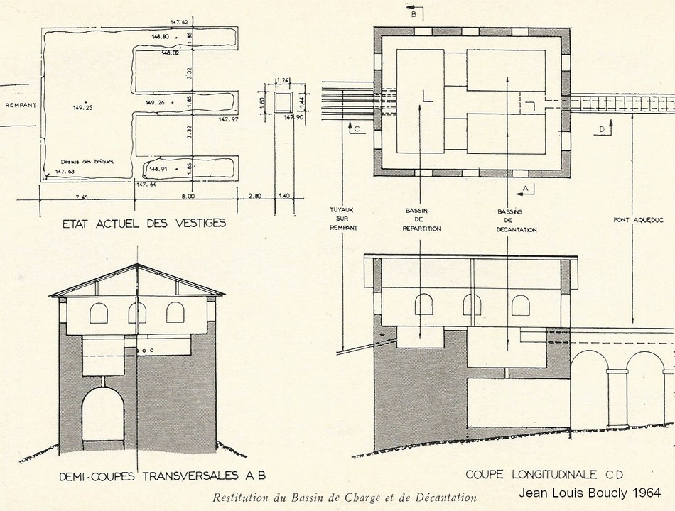 Ces bassins auraient permis une double répartition de l'eau et par là une décantation plus grande, il était aussi plus aisé, dans ce cas, de procéder à la réparation de l'un d'entre eux sans arrêter pour autant l'écoulement de l'eau (pour la même raison, des conduites doubles avaient été aménagées sur le pont-aqueduc de Metz).