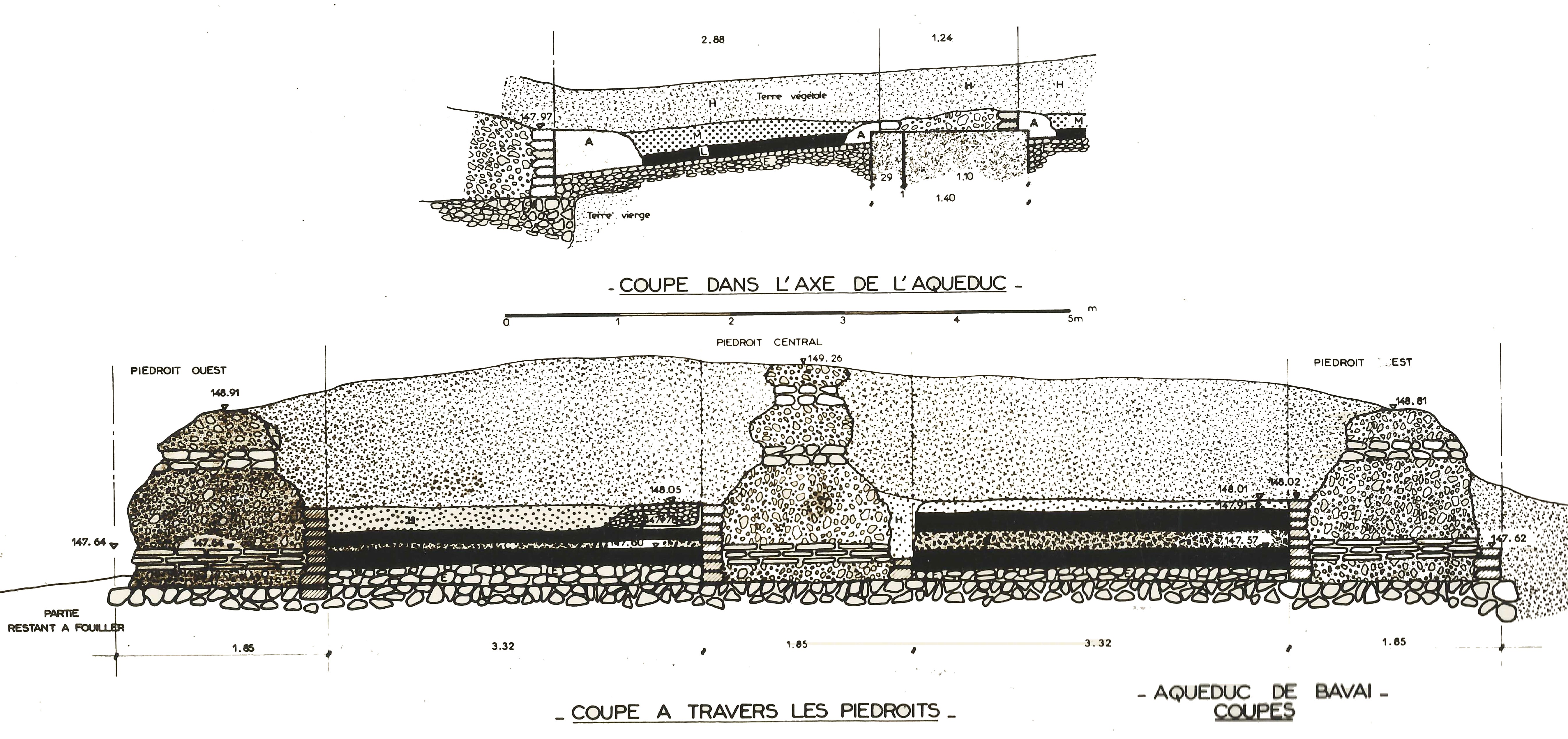Nous voyons donc que la dernière pile dégagée maintenait les eaux à plus de 7 m de hauteur puisque le niveau supérieur de sa fondation est à la côte 147,90. Ces petites piles devaient être bâties sans fruit, il semble que la largeur des soubassements a été calculée de manière à être égale à la moitié de l'ouverture de la voûte supportée soit 2,80 : 2 = 1,40 m. Quant à la section de la pile, sa longueur est exactement la même que la largeur totale de la canalisation souterraine de l'aqueduc soit 1,44 m.