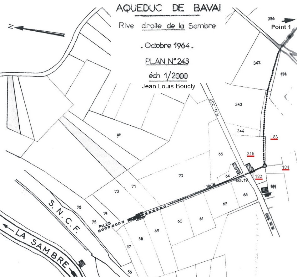 A 500 m du point 1 et à l'angle formé par les limites des parcelles 183, 184, 182, 315 (plan 243 partiel) l'aqueduc cessait de décrire une large courbe pour adopter un parcours rectiligne. Il sortait alors de terre, et à cet endroit devait se trouver un petit bassin qui, tout à la fois, réglait la vitesse de l'eau, évacuait les crues et évitait un changement trop brusque de direction (comme celui de l'aqueduc de Metz, rive gauche de la Moselle). Au sortir de ce bassin, l'aqueduc était supporté par un long massif de soutènement encore en partie visible. Il s'agit d'un long mur dont nous trouvons les traces le long du sentier qui se dirige vers la rivière.