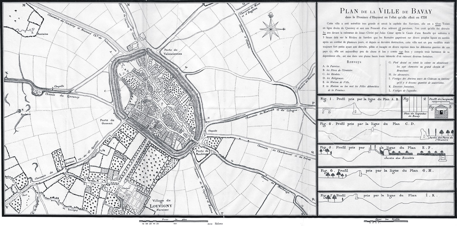 L'examen de ce plan laisse clairement apparaître : "qu'à partir d'une vingtaine de toises de l'endroit où le chemin de terre arrivant d'Audignies, rejoint le vieux chemin de La Longueville, l'aqueduc suit celui ci jusqu'à la Porte de Mons appelée sur ce document, Porte de Maubeuge." Egouts et aqueducs bavaisiens. Henri Biévelet. page 23. Société Royale d'archéologie. Bruxelles.