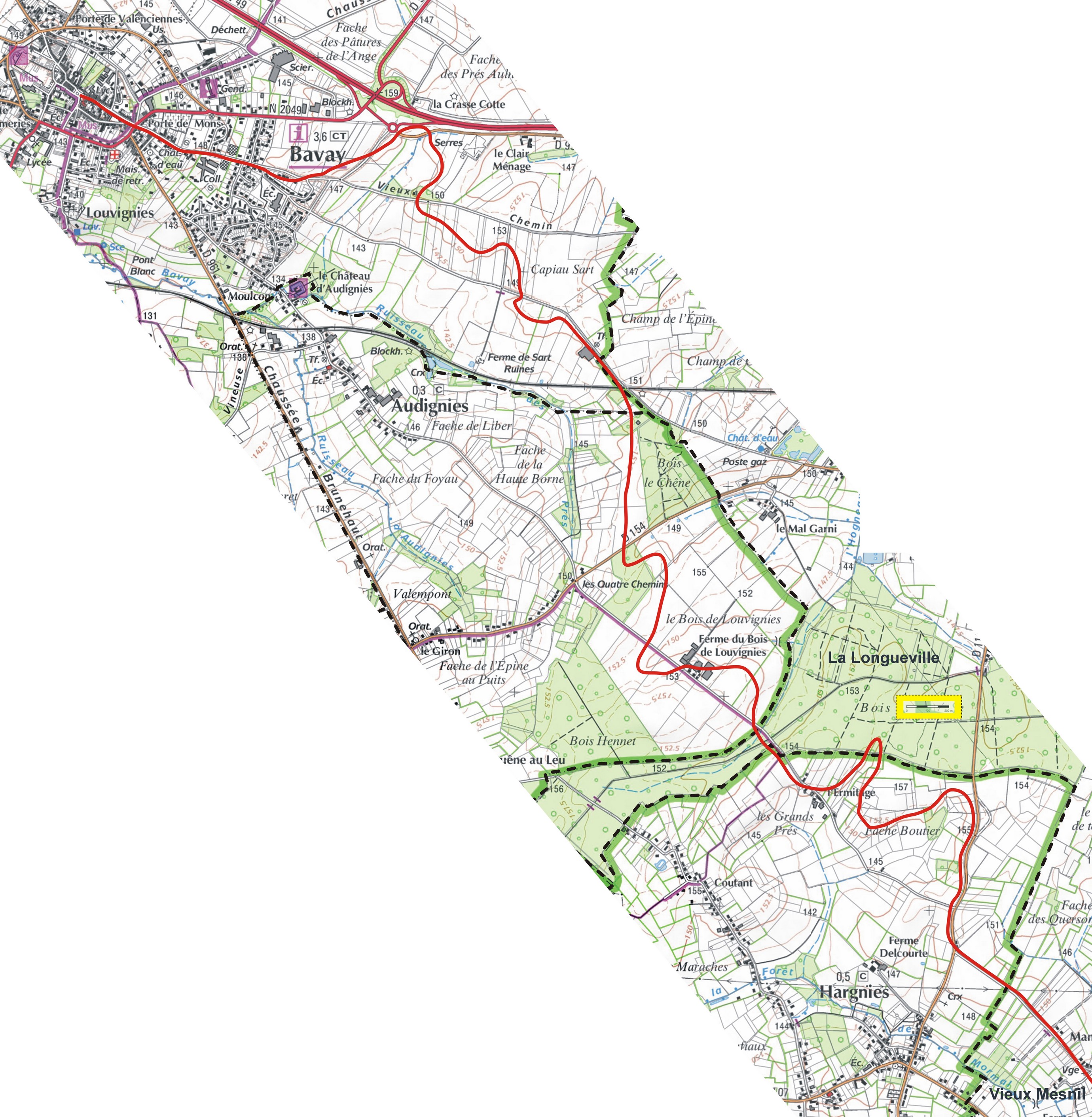 Si nous reportons sur une carte les points de passage signalés par Henault et de Masse, nous constatons qu'ils se trouvent dans la bande de terrain située au-dessus de la cote 150 un peu au nord d'Audignies entre Bavay et le Bois de Louvignies.