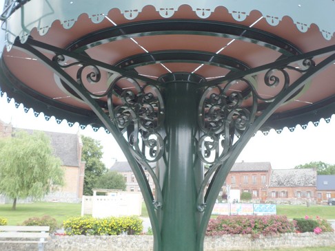 C'est une entreprise de Leval, la Ferronnerie Avesnoise qui à obtenu le marché fin 2015 pour un montant de 8760 €. Ce nouveau kiosque est en fer forgé pour la structure, en aluminium pour la plateforme, et ne comporte plus que quatre pieds dans un souci d’esthétisme.