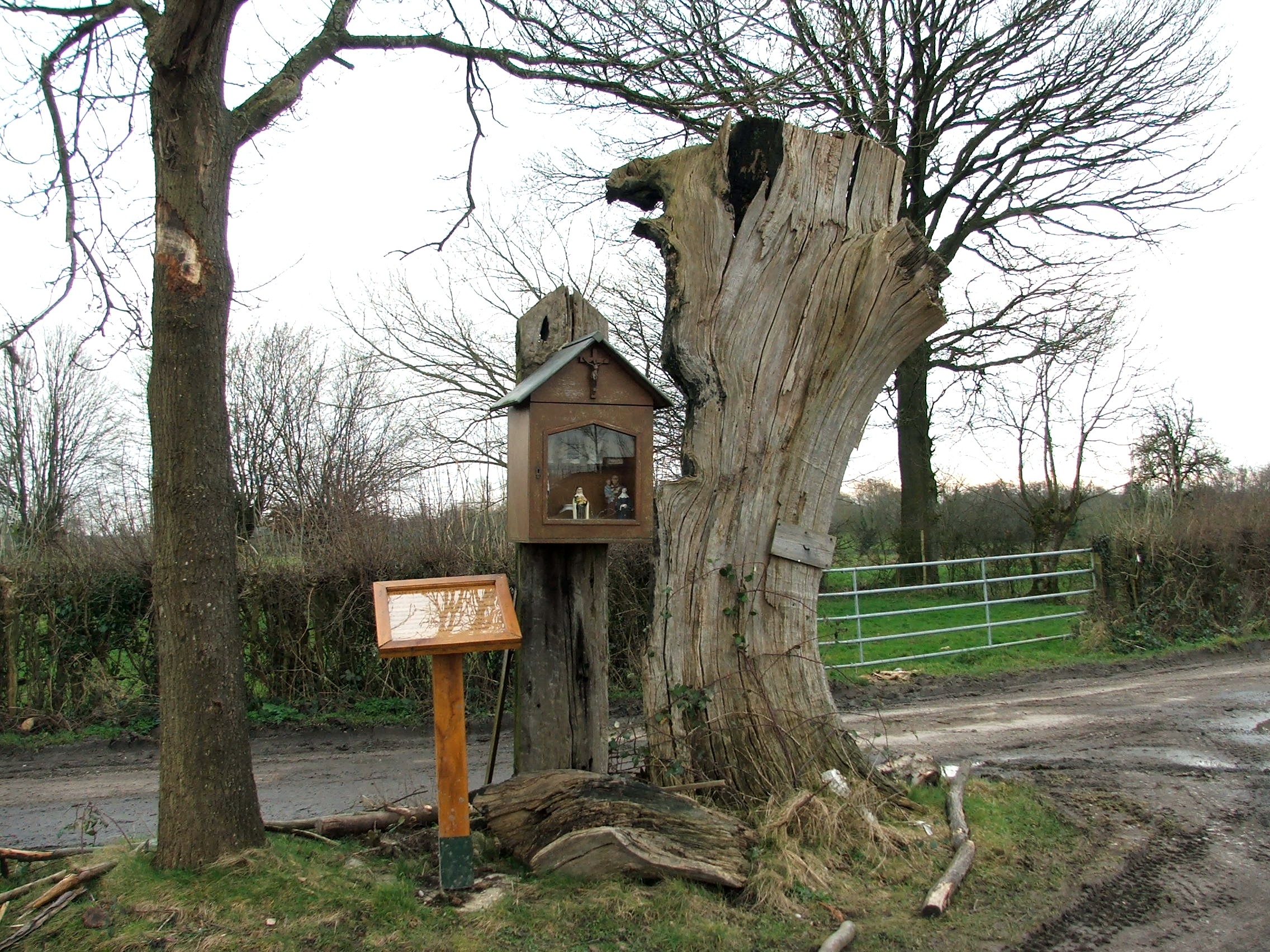 Vierge à l’enfant : statue en bois (tilleul) polychrome, environ 70 cm de haut. De facture également plus récente (mi-XIXème siècle), elle est de composition très soignée et expressive. Placée dans la niche de l’autel de la nef latérale nord, elle symbolise la dévotion très courante et très ancienne du culte marial.