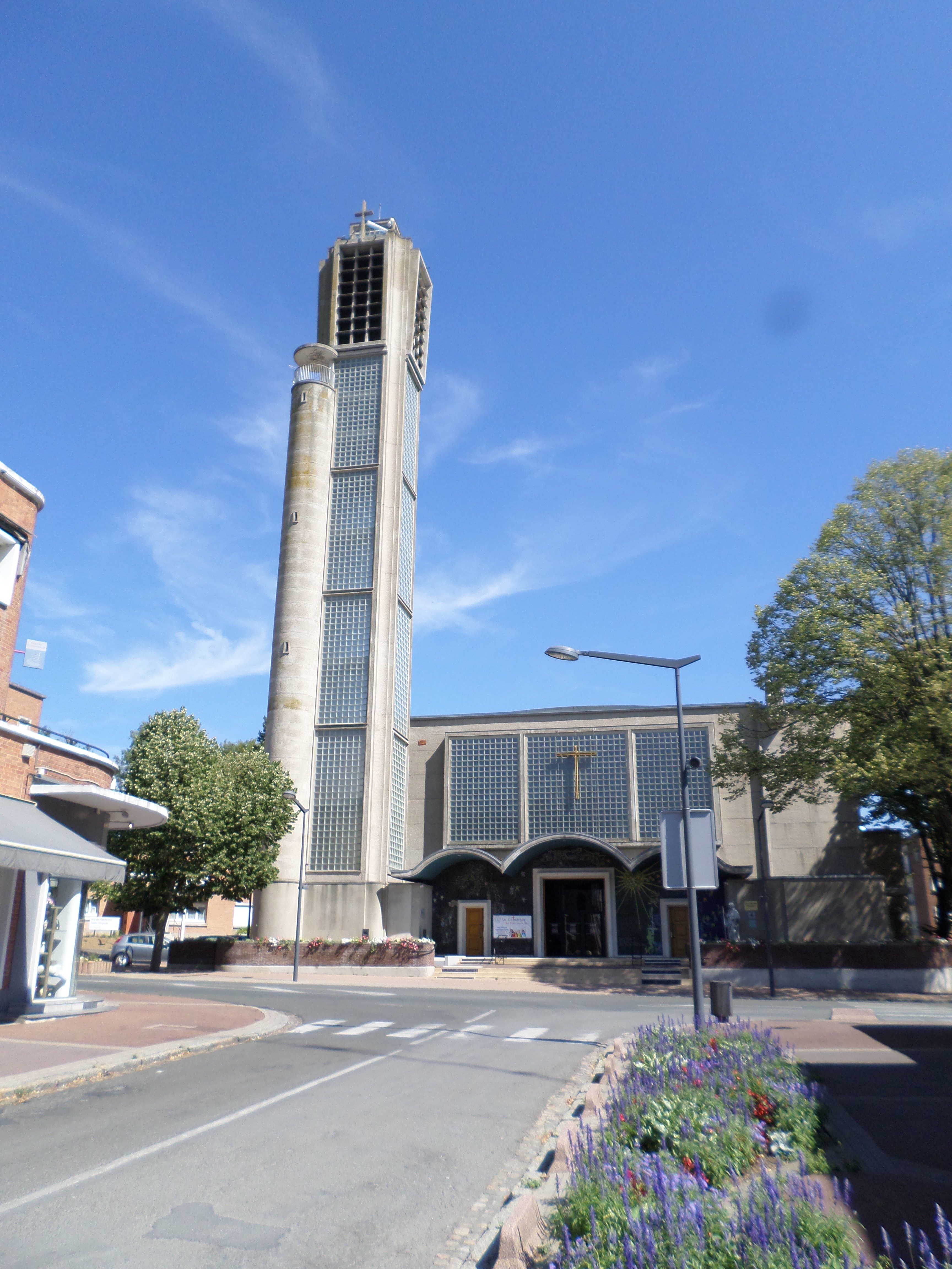 et les vitraux sont dus à Bernard Pelletier. Son clocher de 43 m de haut, éclairé de briques de verre, est adjoint d’une tour cylindrique contenant l’escalier d’accès au carillon (28 cloches). Posées sur une stèle en attique, les statues de 2,5 m de haut des apôtres Pierre et Paul constituent les deux seules sculptures ornementales de la façade, qui comporte par ailleurs un porche d’entrée divisé en trois parties, symboliques de la trinité chrétienne.