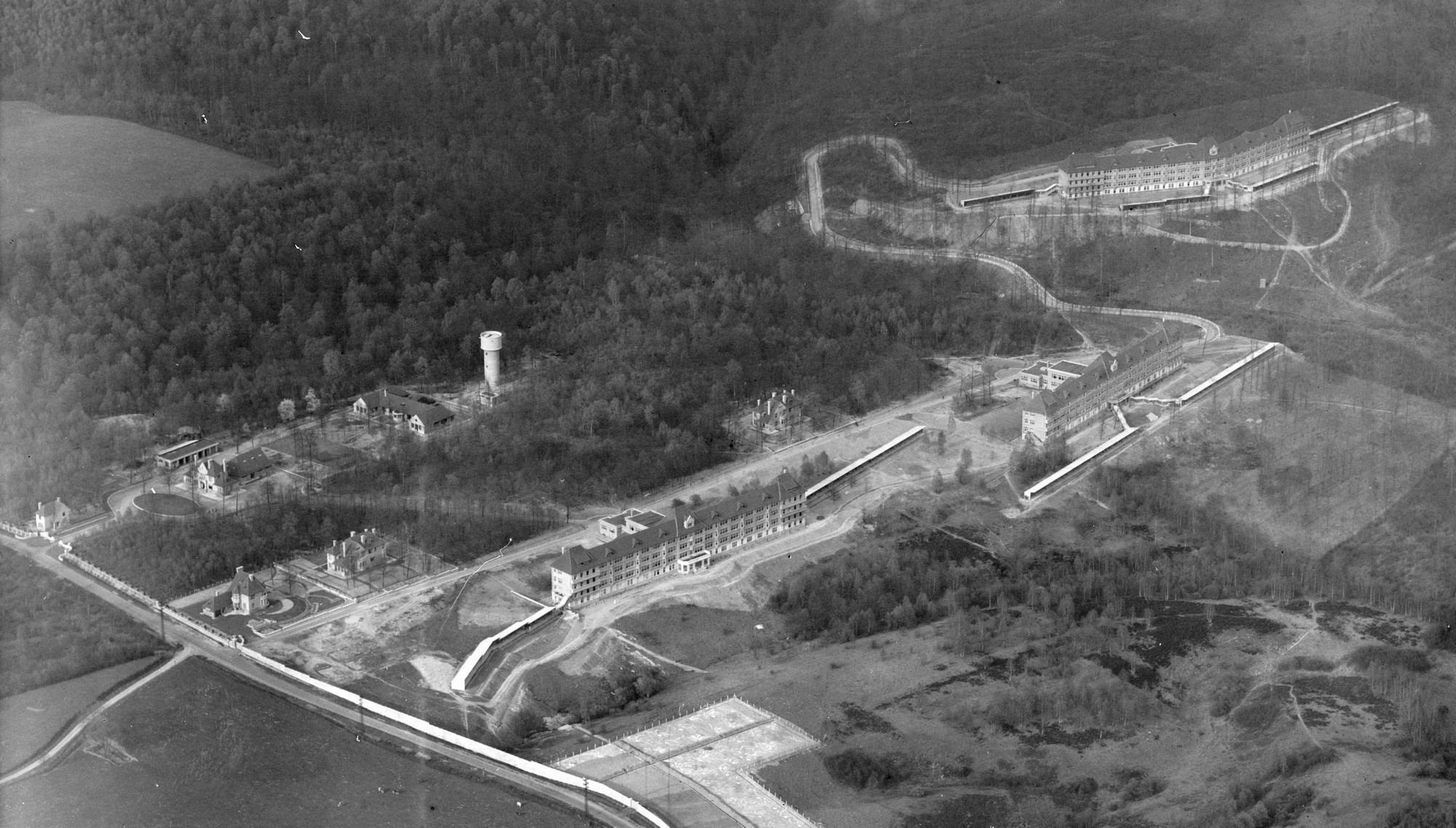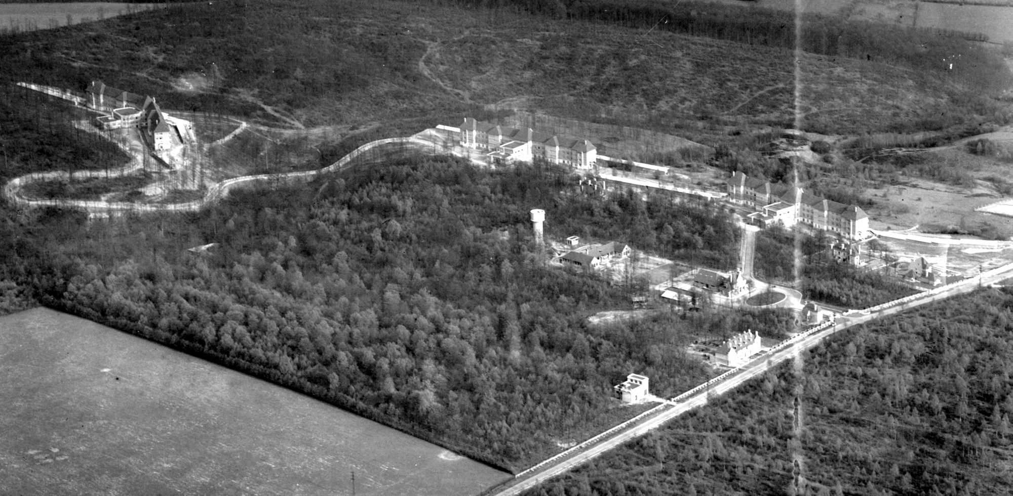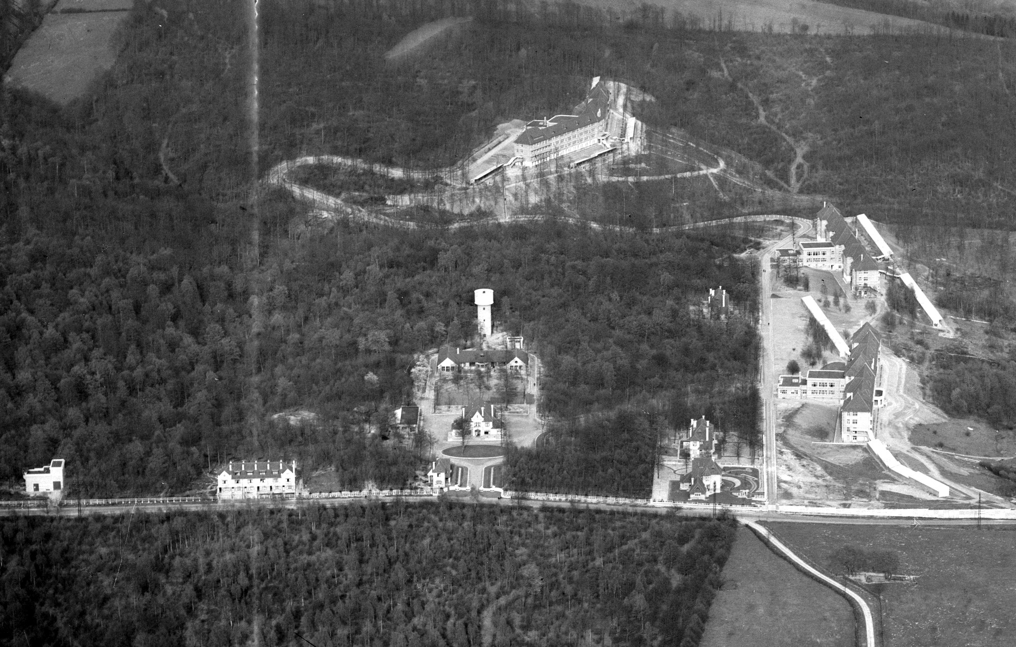 Lorsque le visiteur pénètre dans la propriété en venant de Solre le Château, il rencontre, sur sa gauche un poste de transformation où, sur 3 lignes, arrive sous 45.000 V, le courant électrique alimentant le Sanatorium entièrement électrifié ; un groupe de 6 habitations occupées par les maîtres ouvriers ; une salle d’attente pour abriter les malades et leurs familles qui attendent l’autobus ; une école très coquette pour les enfants du personnel et enfin le pavillon de la concierge. Face à l’entrée, au-delà des pelouses où des parterres à la française, jettent l’été une note riante, le pavillon d’Administration. Plus loin, la buanderie et les services de désinfection. Enfin, au-delà, a été édifié, en 1950, le Centre de Rééducation dont l’intérêt sera souligné plus loin.