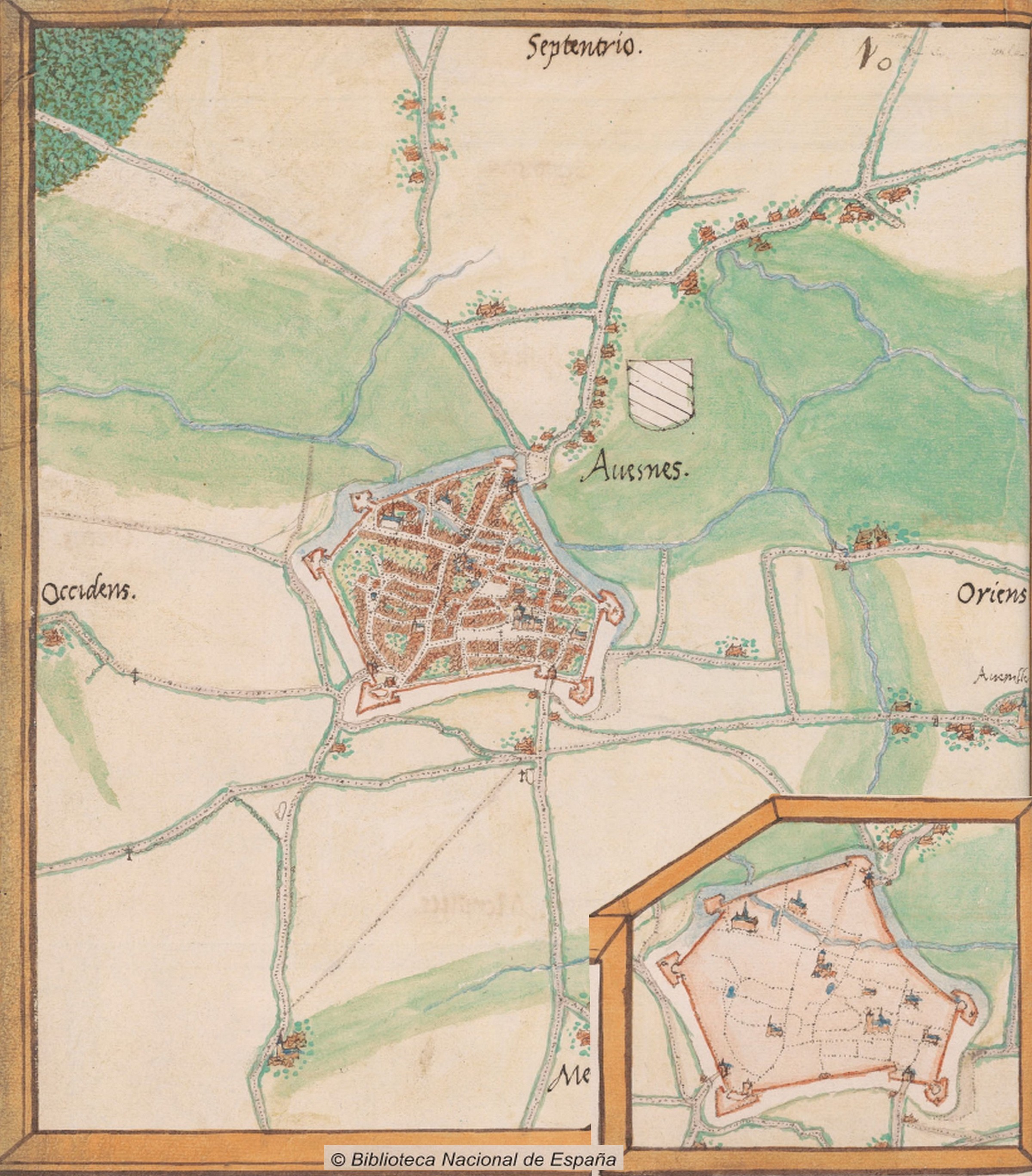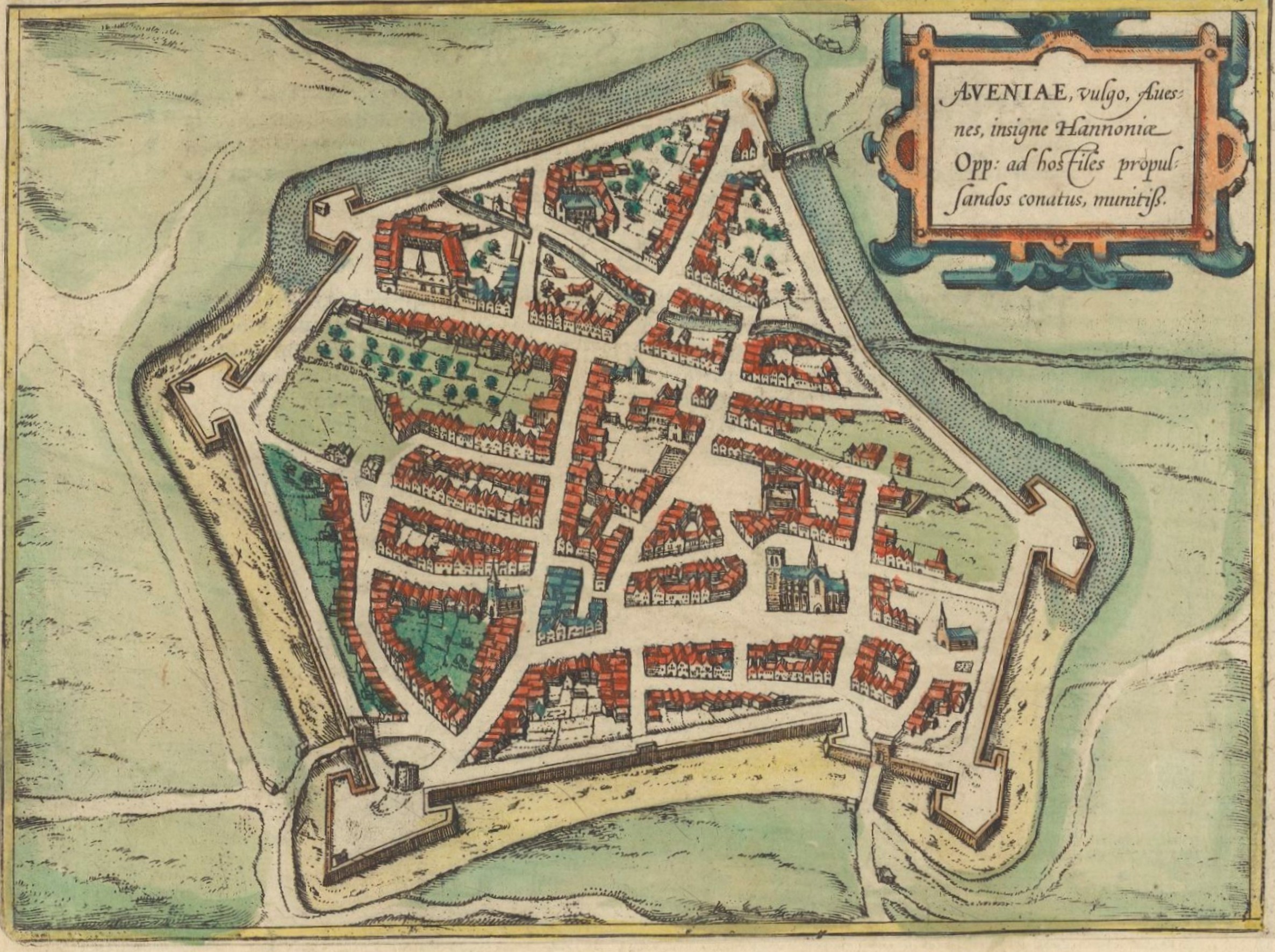 Cette vue perspective est tirée d'un atlas allemand publié vers 1540 et renfermant de fort belles vues de la plupart des villes fortes des Pays-Bas. Dans cet atlas, le caractère des habitants des villes est symbolisé par un animal qui donne son nom au plan. Les Avesnois avaient alors la réputation d'être légers et curieux au point de négliger la sécurité de leur ville (celle-ci avait été surprise par quatre ou cinq cents Français, dans la nuit du 18 au 19 décembre 1523). Les vers latins et allemands ont peu près le même sens : « De même qu'une pie qui sautille sans arrêt se fait prendre par la ruse, de même une jeune fille qui aime trop la danse finit par perdre sa couronne d'oranger ». En haut : Curiosa virgo semper in periculo. Et, plus bas : Avenna in Arschott.