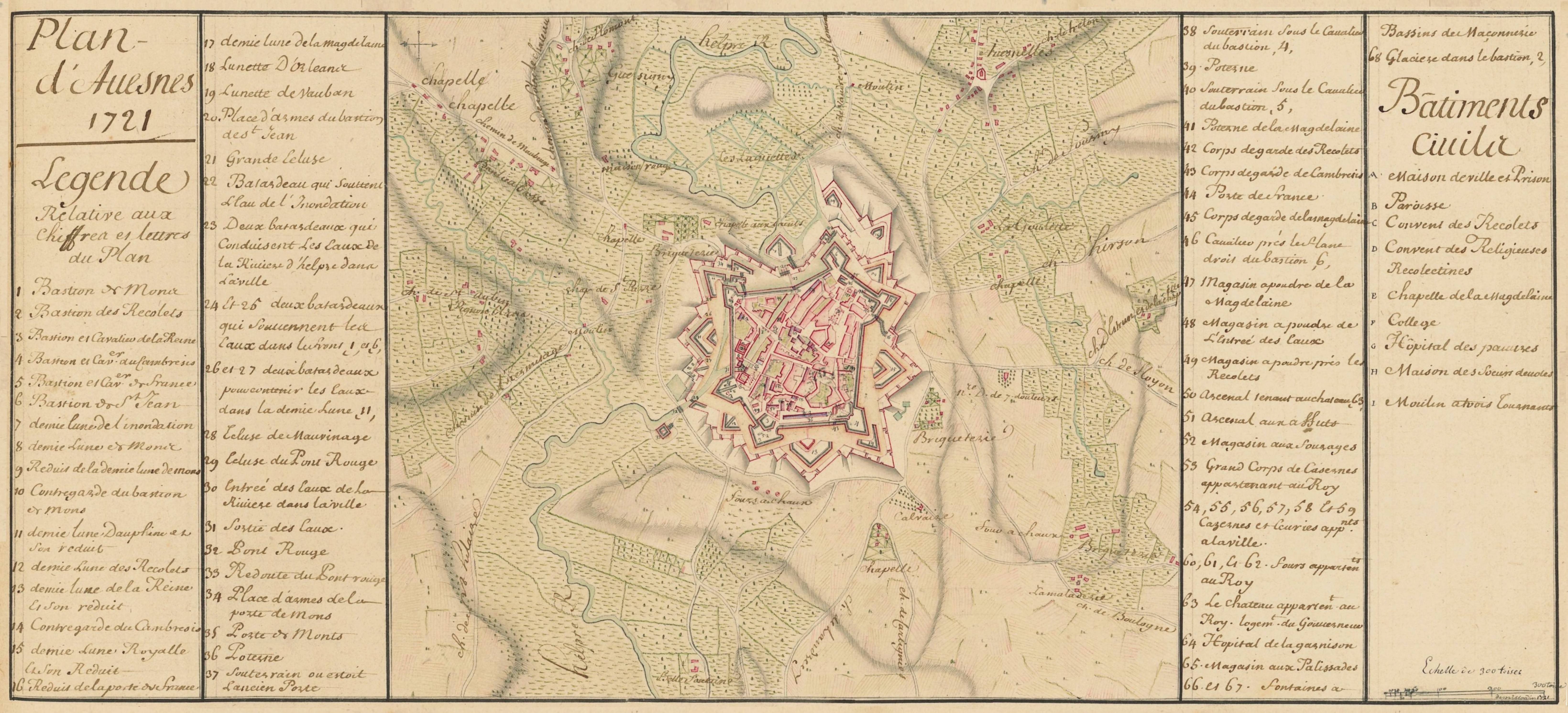 Les bastions de Beaumont (ou de Mons) (01) près de la route de Mons, de Renty ou des Récollets (02), de la Reine de Hongrie (03), de Gallant ou de Cambrai (04), Furieux ou de France (05) de Chimay ou Saint-Jean (06). Trois portes furent reconstruites, celle d’En Haut (dite encore des Demoiselles ou de Champagne), celle de Mons ou de Mauvinage, et enfin celle de Cambrai.