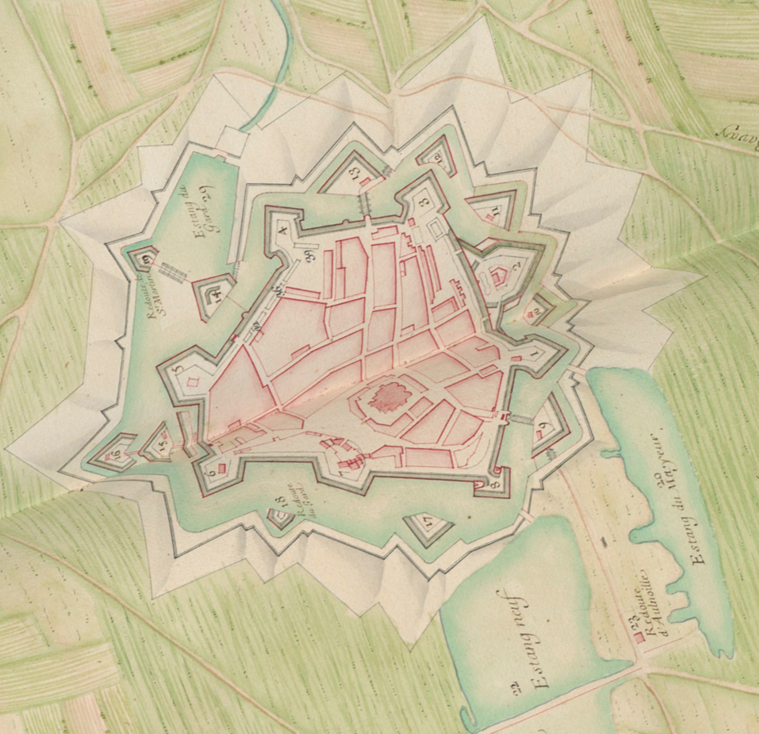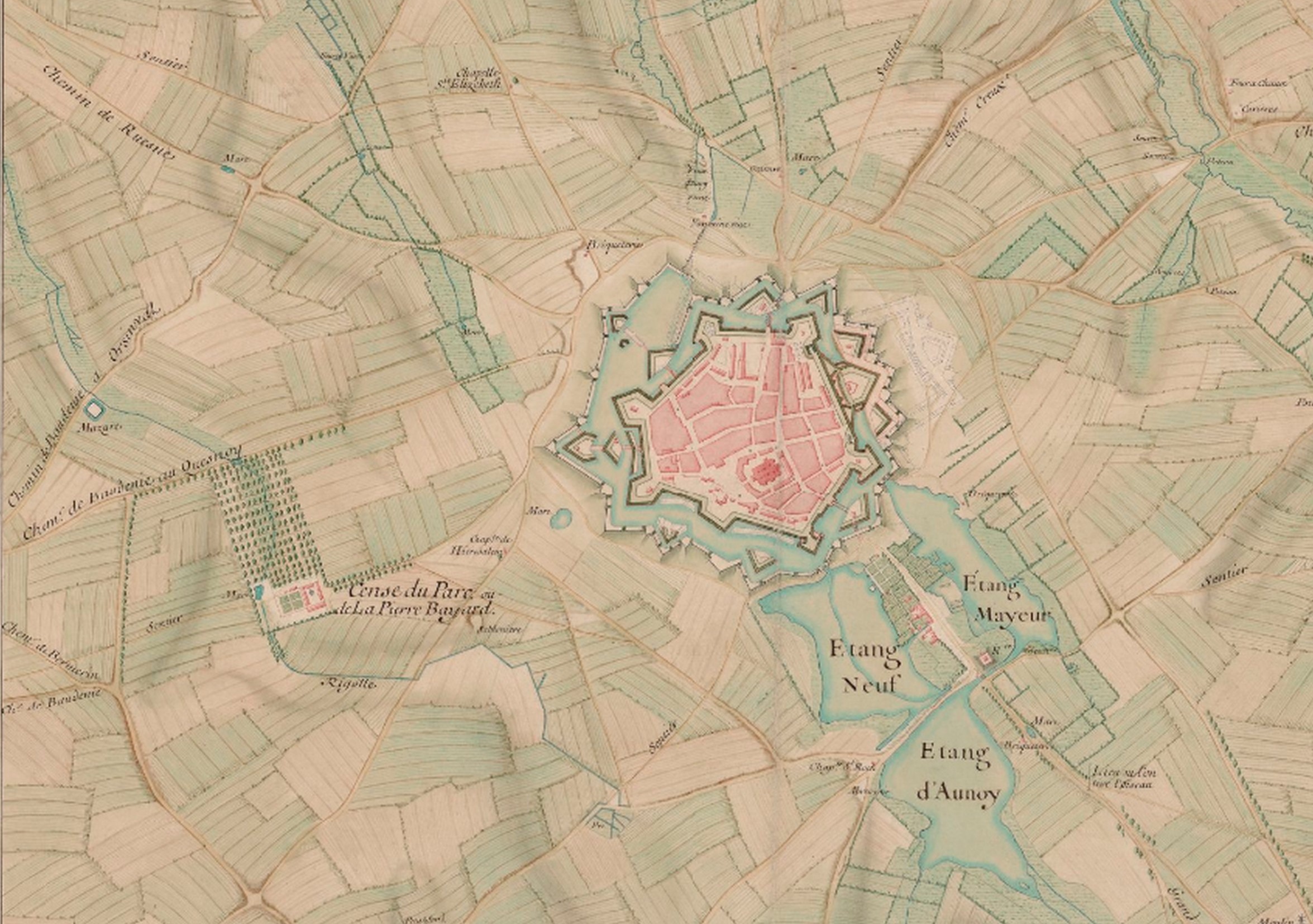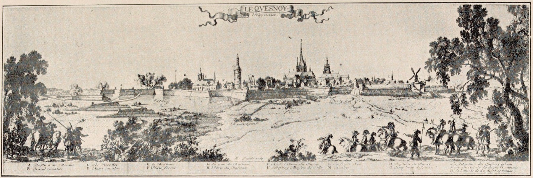 Au premier plan à droite, la porte est probablement celle de Landrecies. L'étang que l'on voit doit être celui d'Aulnoy et le long du ruisseau, l'étang Neuf ou du Pont Rouge n'a pas encore été creusé. La configuration actuelle jusqu'à la porte de Fauroeulx permet cette hypothèse.