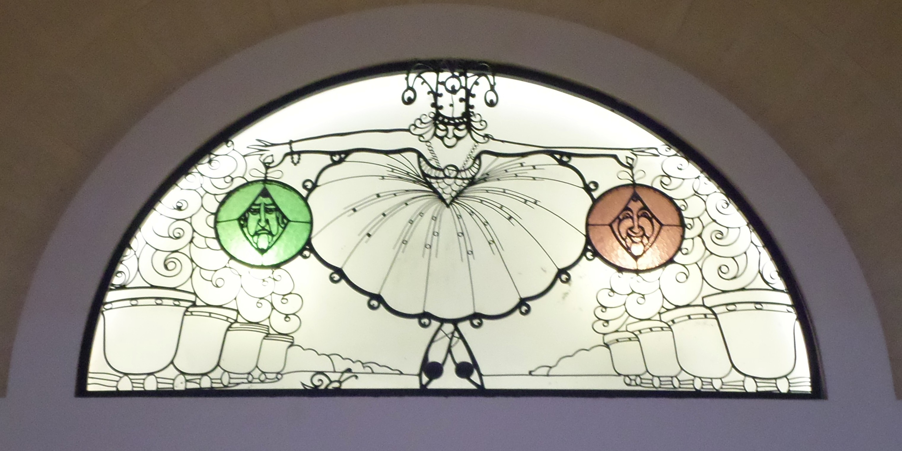 On peut apercevoir juste au-dessus de la porte menant à la salle de bal une danseuse en tutu qui semble nous accueillir. Il s’agit d’un verre sablé déposé sur le tympan sur lequel est maintenu le personnage de la danseuse.