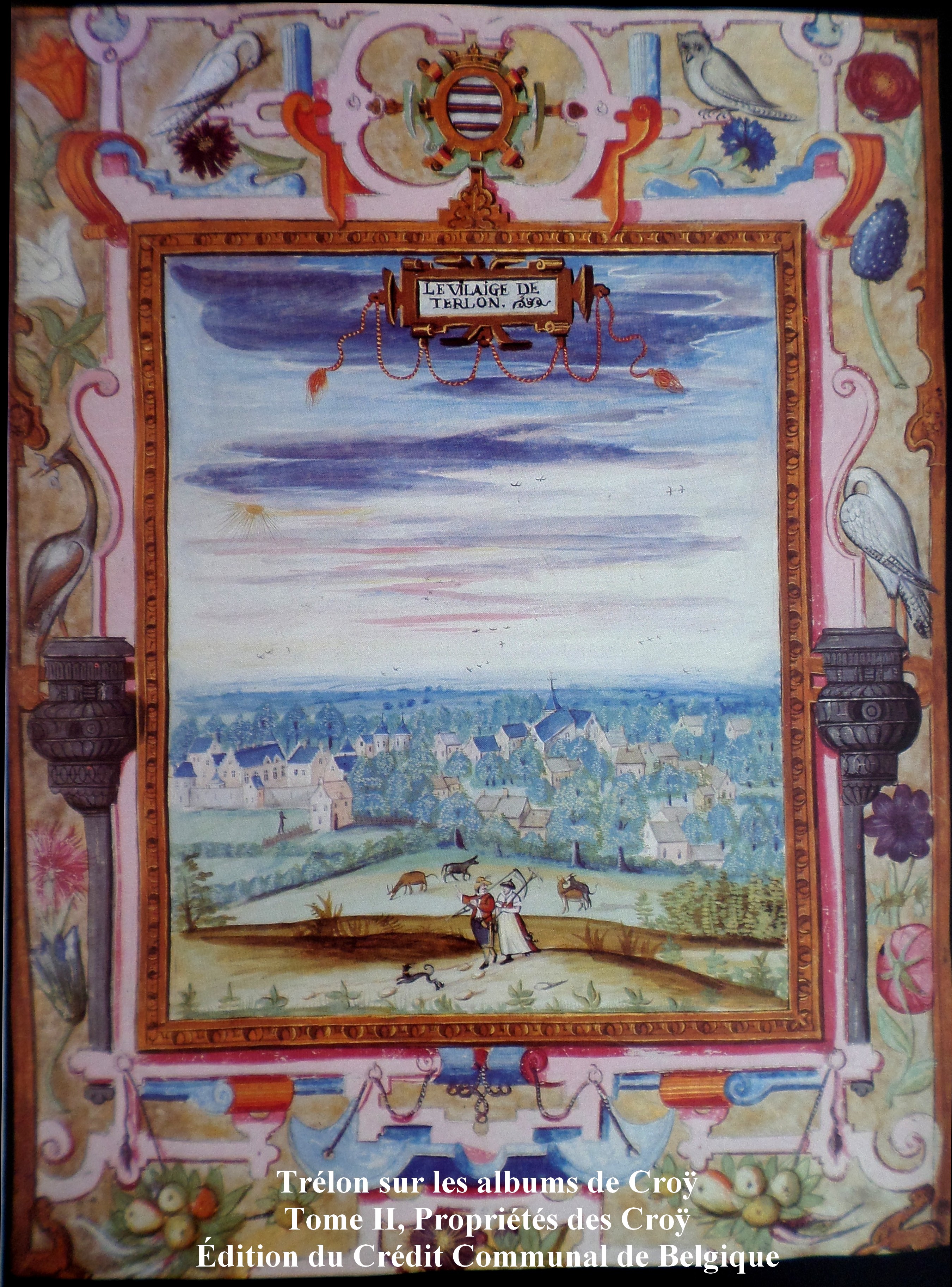 "Le Vilaige de Terlon". Au premier plan se déroule une scène de la vie campagnarde. Le second plan décrit un bourg important avec la majorité des chaumières regroupées autour de l'église composée de deux vaisseaux perpendiculaires sans que l'on puisse situer précisément la nef, le chœur et les chapelles. La flèche de charpente du clocher est couverte d'ardoise. A gauche de l'édifice, deux constructions, elles aussi couvertes d'ardoise. A gauche le château et ses ouvertures à meneaux et traverses, pignons à gradins pour au moins quatre des bâtiments qui le composent. L'ensemble est cerné de murs ponctués de tours de formes et dimensions variées et s"ouvre sur l'extérieur par un portail entre deux grosses tours rondes. Il fut manifestement construit au XVe ou XVIe siècle. De nos jours, le bourg de Trélon a pris de l'importance mais l'église du XVIe siècle est toujours présente (en partie).