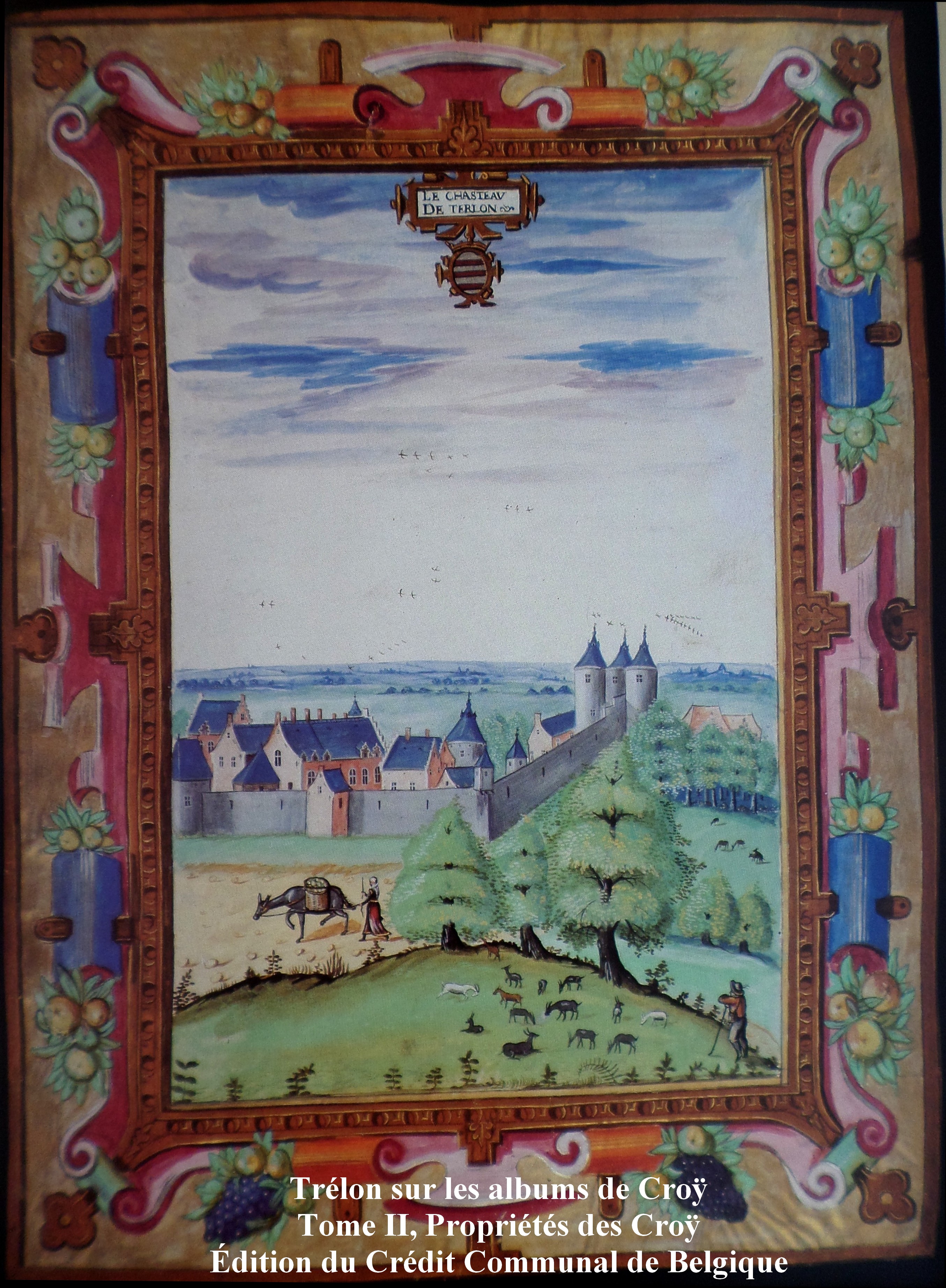 "Le chasteau de terlon". Vue présentée de l'ouest. Au premier plan, une scène de la vie quotidienne à la campagne. Au second plan, se dresse l'imposant château avec son mur d'enceinte en pierre, percé de meurtrières sur la partie haute. De gauche à droite on remarque une tour en fer à cheval puis une tour carrée plus petite en briques. A l'angle une échauguette sur consoles en bois. Le mur s'élève ensuite en escaliers pour rejoindre une grosse tour d'angle proche du châtelet d'entrée gardé par deux autres tours identiques. Leur couverture en poivrière est percée de lucarnes hautes et se couronne d'un bulbe. C'est le même type de tour qui défend la muraille derrière le château et que l'on voit à moitié ainsi qu'une dernière tour dont on aperçoit le sommet à l'angle opposé. A l'intérieur de l'enceinte on distingue deux groupes de bâtiments, construits en briques et couverts de toitures à deux versants en ardoise et présentant des pignons à redents. L'édifice le plus visible présente un bon nombre de cheminées et cinq lucarnes, il s'agit sans doute là du bâtiment principal d'habitation. A l'origine, c'est Nicolas d'Avesnes qui fit construire ce château en 1150. De par sa situation géographique, il eut à subir beaucoup de sièges et destructions jusqu'en 1678, date de rattachement d'une partie du Hainaut à la France. Il sera à nouveau reconstruit en 1704 et considérablement modifié vers 1860 sous la direction de l'architecte parisien Parent. Propriété de la famille de Mérode depuis le XVIe siècle, c'est la princesse de Mérode qui l'occupe aujourd'hui.