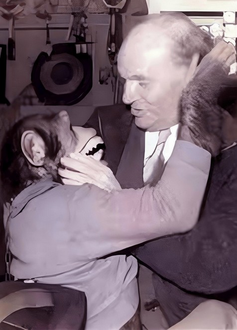 Ces deux photos symbolisent l'Histoire du zoo de Maubeuge créé en 1955 sous le nom de "Jardin de la Roseraie" par le docteur Pierre Forest alors maire de la ville. Fernand Wilmart, un des pionniers du zoo, et dresseur de singes, a fait les grandes heures du parc zoologique en compagnie de "Moriss" dont les facéties dépassaient largement les limites de l'Avesnois. Il mettra en scène des chimpanzés dressés à jongler, danser, taper à la machine à écrire ou faire de la bicyclette dans un spectacle intitulé "L’académie des singes savants". Les débuts ont été modestes avec un pigeonnier et un petit enclos où l'on pouvait voir des cochons d'Inde. Très vite après sa création, chimpanzés, chameaux, et paons en couple sont arrivés. Les éléphants et les otaries arriveront à la fin de la décennie.